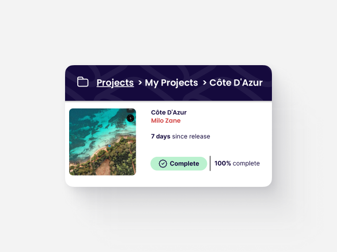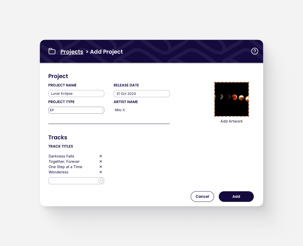 - Edit: Modify the Project’s details (e.g., name, release date, type, track titles, artwork).