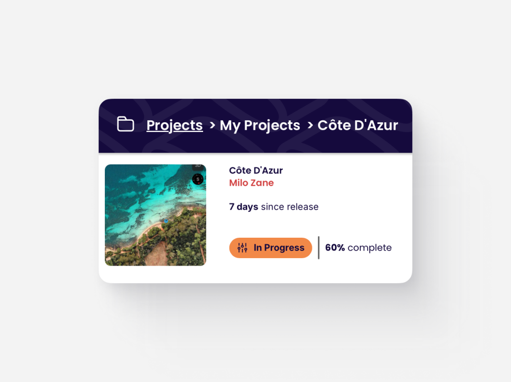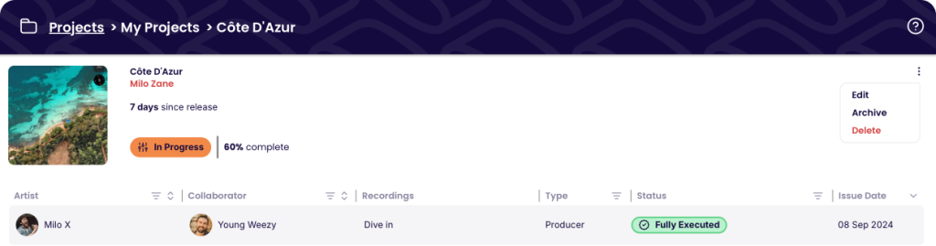 Projects with an In Progress status indicate that one or more Songpacts associated with the Project have been started but not yet fully executed.